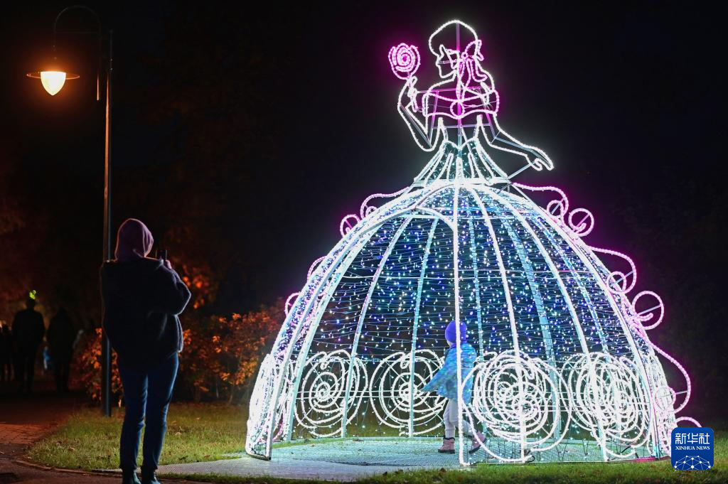 这是10月25日在波兰华沙市郊的波兰科学院植物园“光之花坛”灯光展上拍摄的彩灯造型。