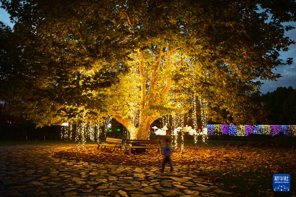 10月25日,在波兰华沙,搭客参不雅波兰科学院植物园举办的“光之花坛”灯光展。